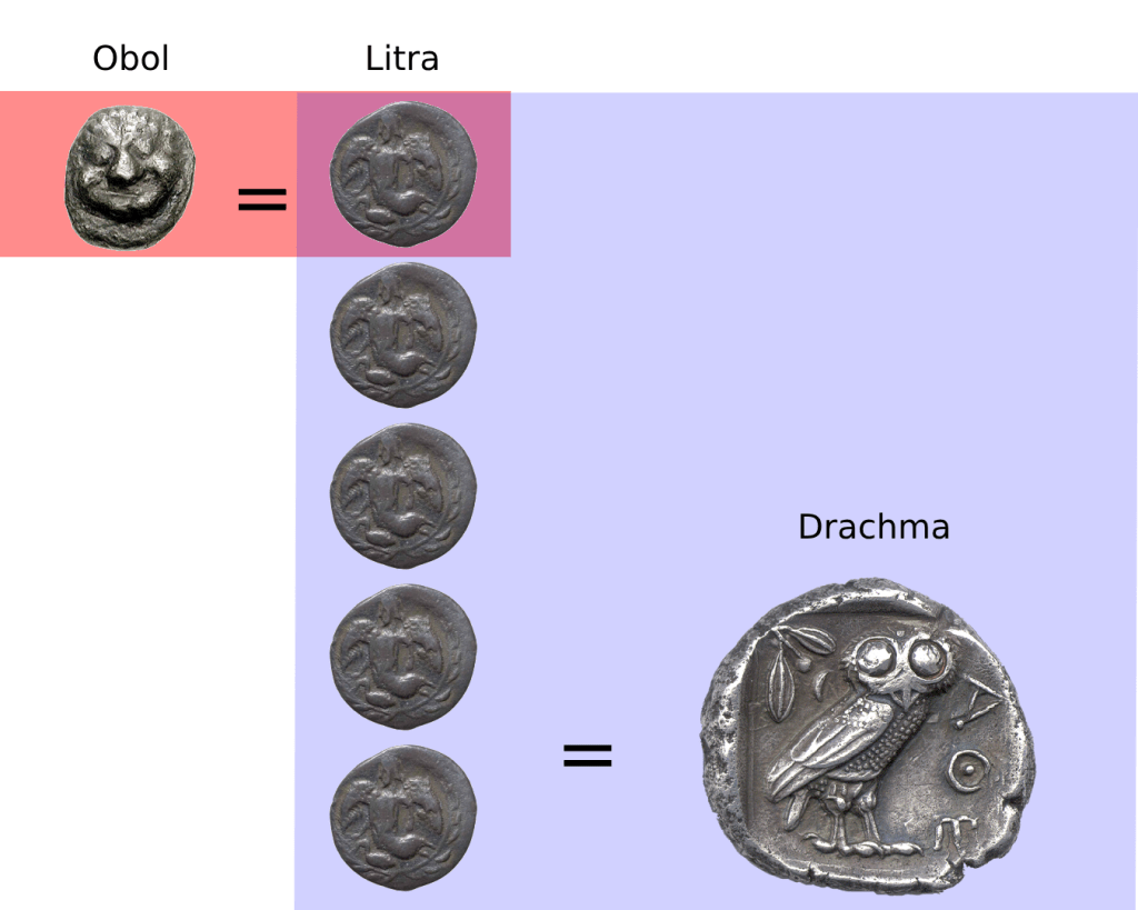 To trace back some of its roots, we head to Ancient Greece, where “litra” (Ancient Greek: λίτρα) was a silver coin in the Archaic to pre-Classical period, equivalent to 0.87g or 0.031oz. It had roughly the exact value of an obol, a Greek currency made of copper or bronze, and was 1/5 of a drachma, another Greek currency, but made out of silver, sometimes gold. So essentially, it looked something like this: