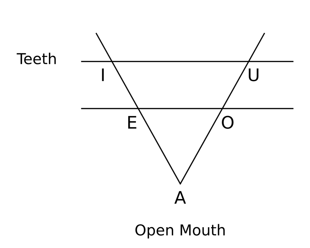 Think of the V Shape as the movement of the jaw, corresponding to the vowel sounds represented in the image on the left. Don’t pronounce the vowels as “aei” for ‘A’, but rather in the Spanish way. So, you will want to pronounce it as “ah”, “eh”, “ee”, “ou”, and “uu”, if referring to the vowel order that we are familiar in this day and age.